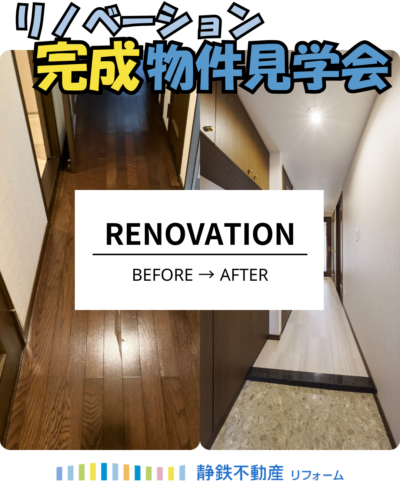 静岡市で築30年のマンションをリノベーションしました。 間取りはそのままに、 キッチン・お風呂・洗面化粧台・トイレの水まわりは全て新しい設備に入れ替えました。 壁紙や床を貼り替え、照明器具も交換。 あると便利な和室も、畳表替えと障子の貼り替えで、清潔で明るい室内になりました。 また、今回はカーペット敷の洋室についてもフローリングに貼り替えをして、他の室内と統一感のある室内になりました。 リノベーションマンションをご覧いただける今だけの貴重な機会です。 水まわりのリフォームはもちろん、マンションのリフォームをご検討されている方は、この機会に是非お問合せください! 【ご注意点】下記ご確認いただきご予約ください。 ※物件のご成約状況によって、ご見学が中止となる場合がございます。ご了承ください。 ※お電話でご予約いただくと最短で3日後の営業時間内にご見学いただけます。 ※お問合せ状況によりご希望の日時に添えない事がございます。 ※所在地、アクセスについては、ご予約いだいた際にお伝えします。
