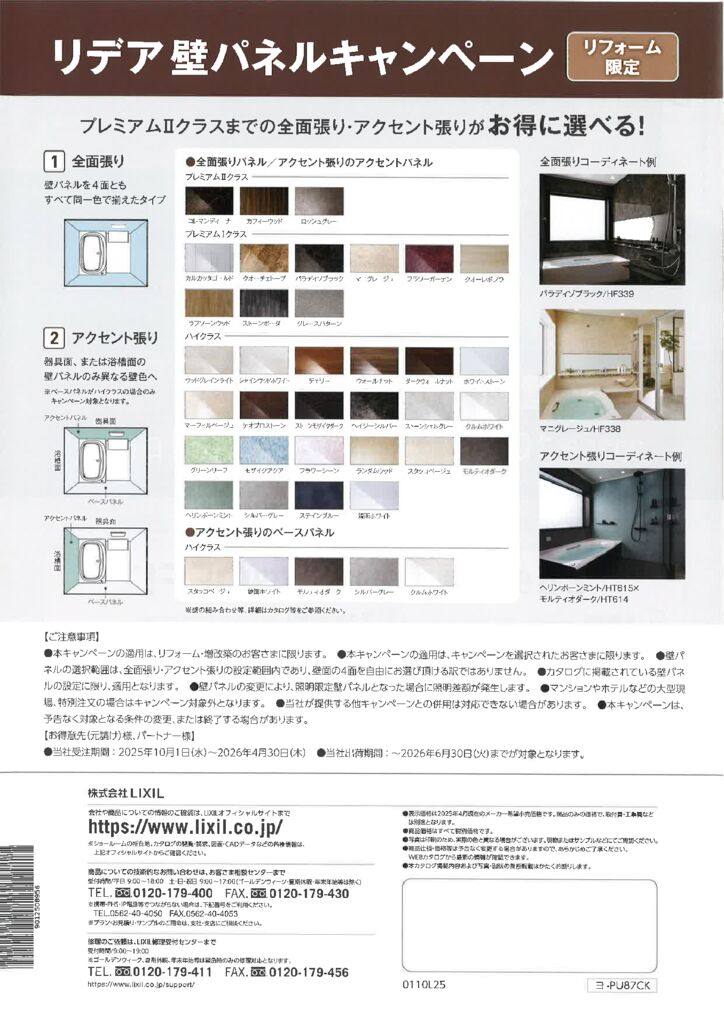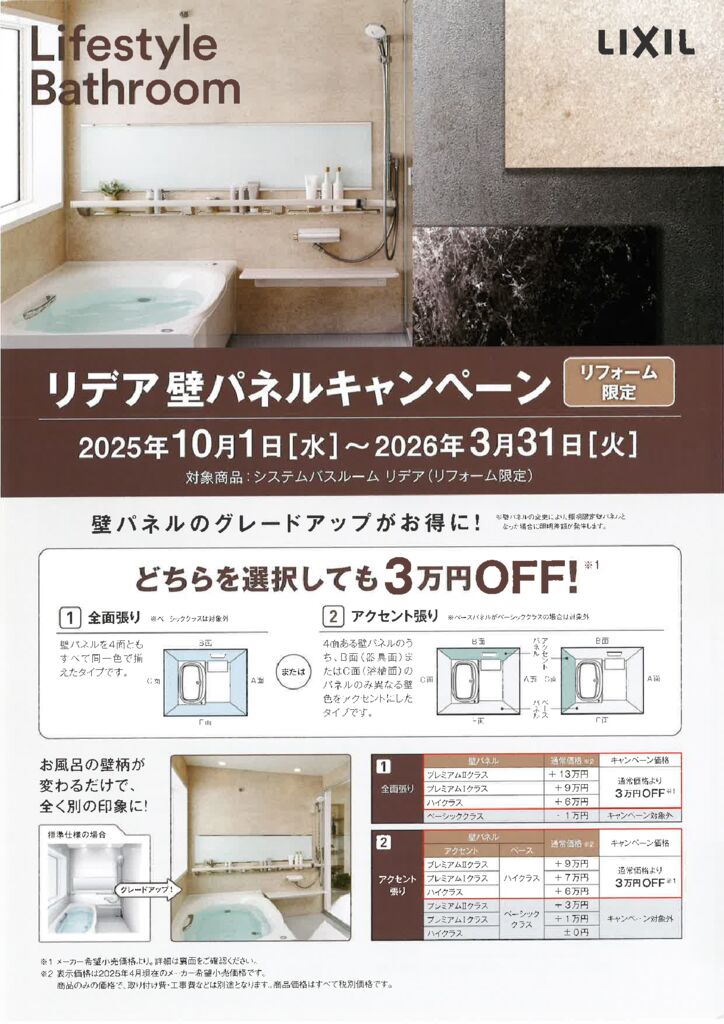お風呂の壁パネルをお得にグレードアップ! LIXILリデア壁パネルキャンペーン!