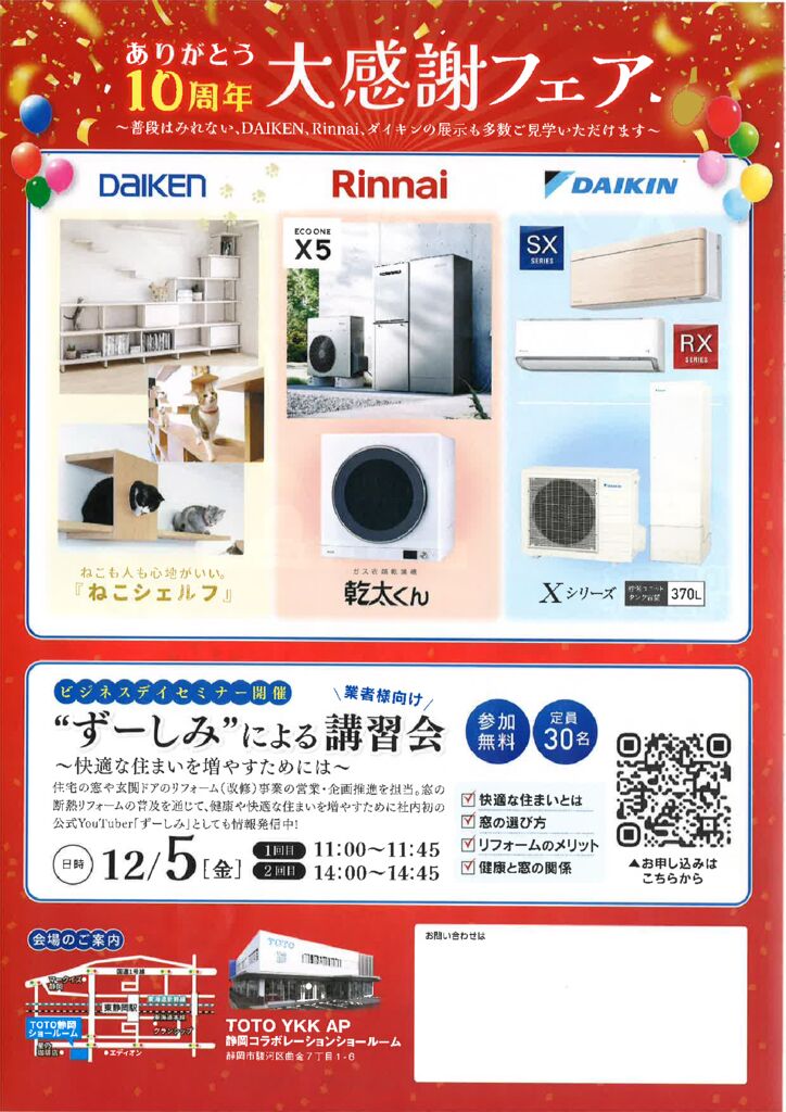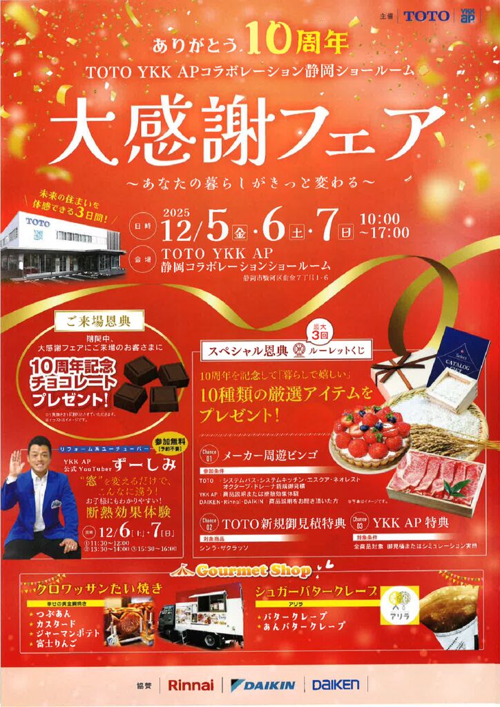 10周年を迎えたTOTO・YKKAP静岡コラボレーションショールームの「大感謝フェア」のお知らせです。