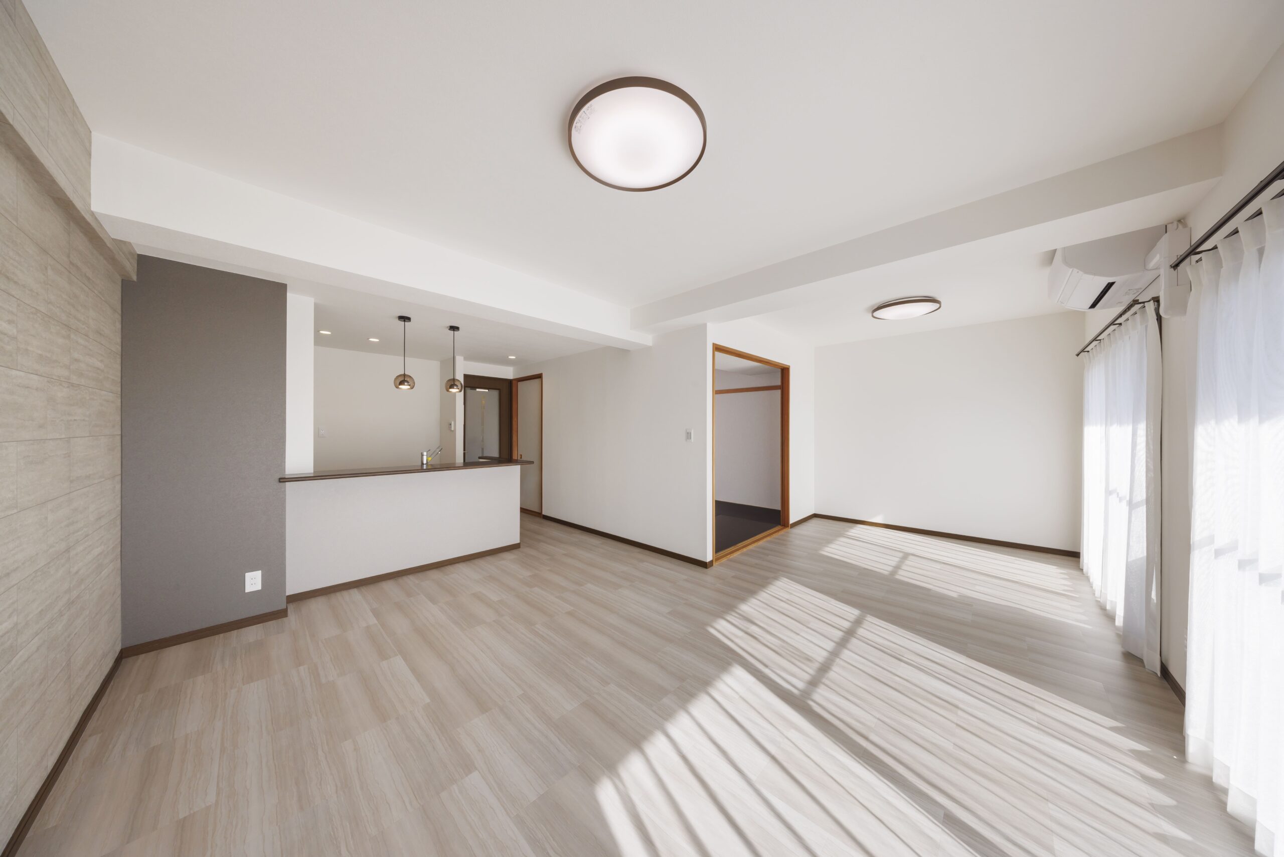 壁紙とフローリングを貼り替えて、明るく広々としたLD。