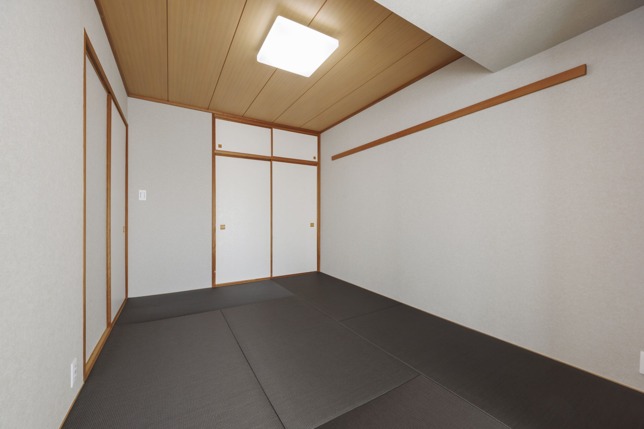 LDから続く和室は、フローリングとのコントラストが映えるシックなカラーの畳に入れ替えました。