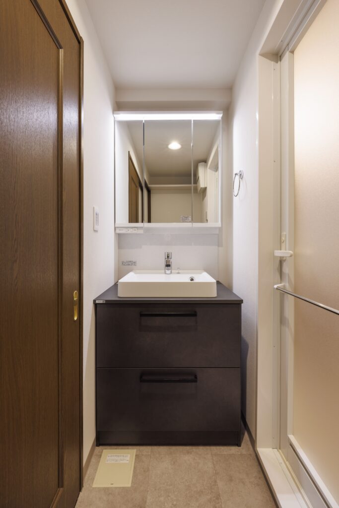 クリナップの洗面化粧台「エルビータ」を採用。収納引き出しの色にもこだわりました。