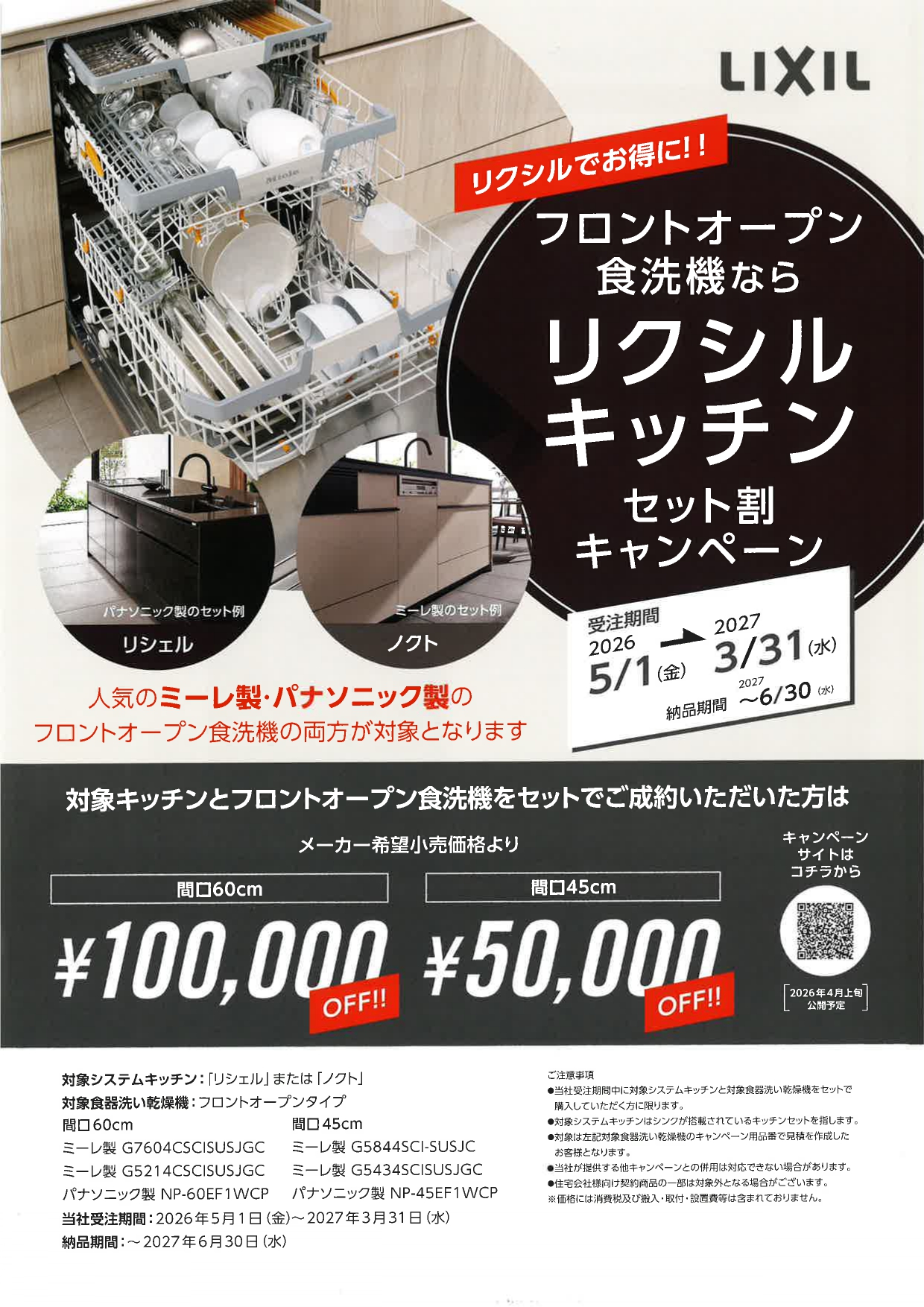 LIXILのシステムキッチン「リシェル」または「ノクト」と、フロントオープン食洗機をセットでご成約いただくと、
